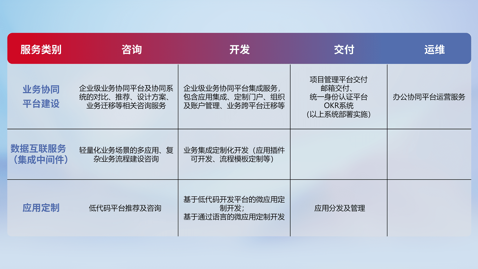 针对钉钉、、、、企微、、、、IDaas等平台级产品提供产品的规划、、、方案、、、、交付、、定制化开发等服务,,,实现如统一协同办公、、智能客户服务、、、、混合会议管理、、、智能数据查询、、、、等业务场景,,,实现数字化转型。。